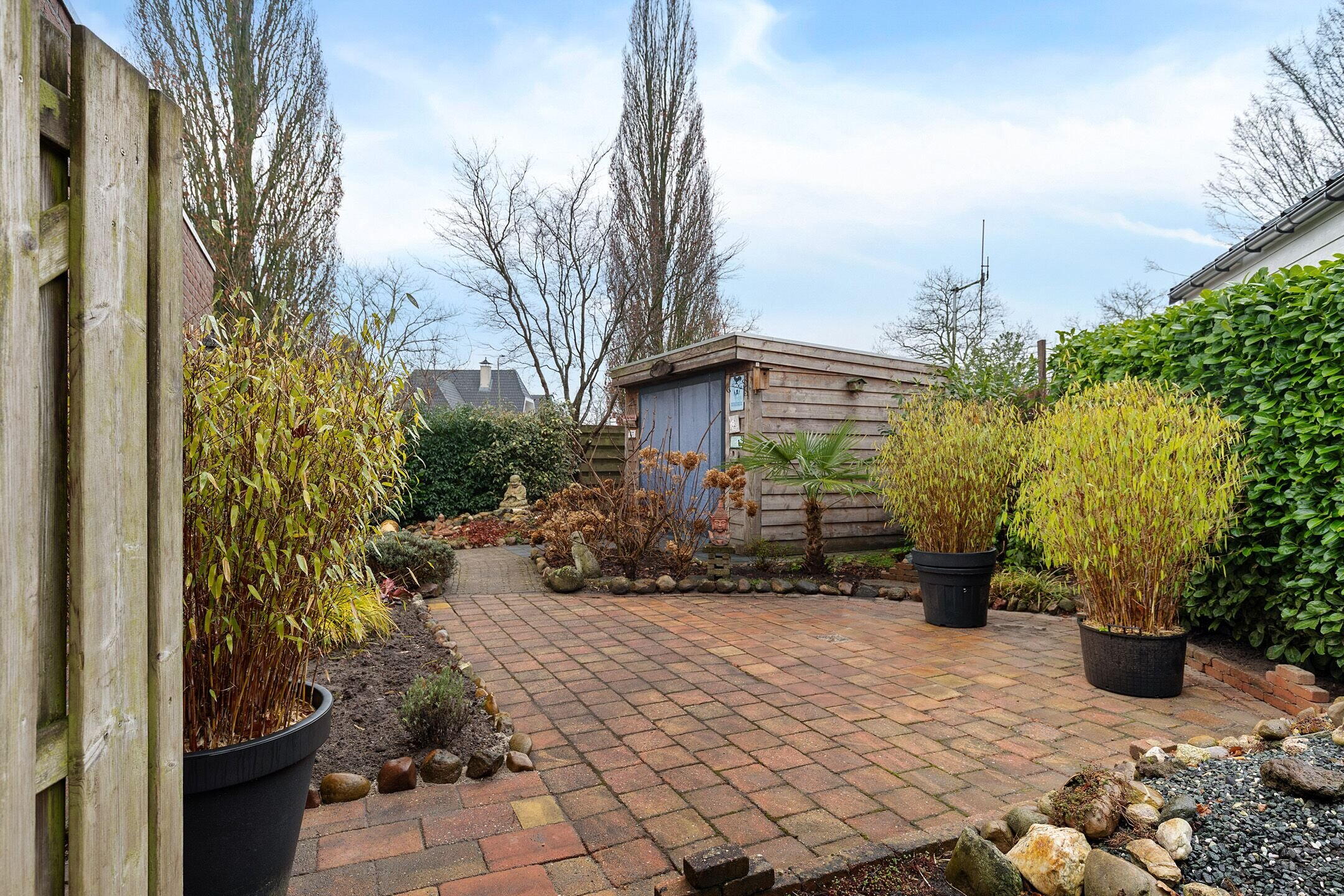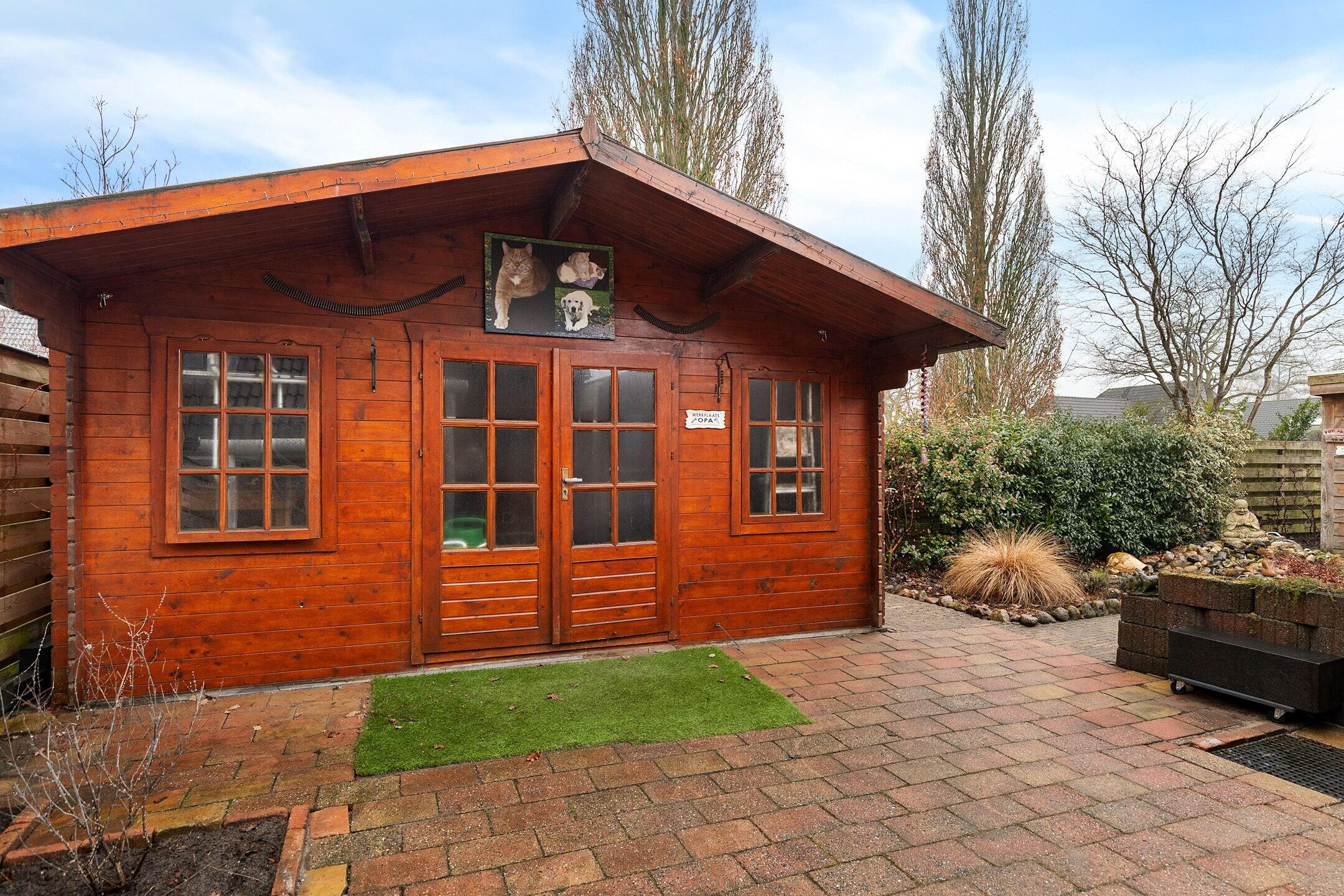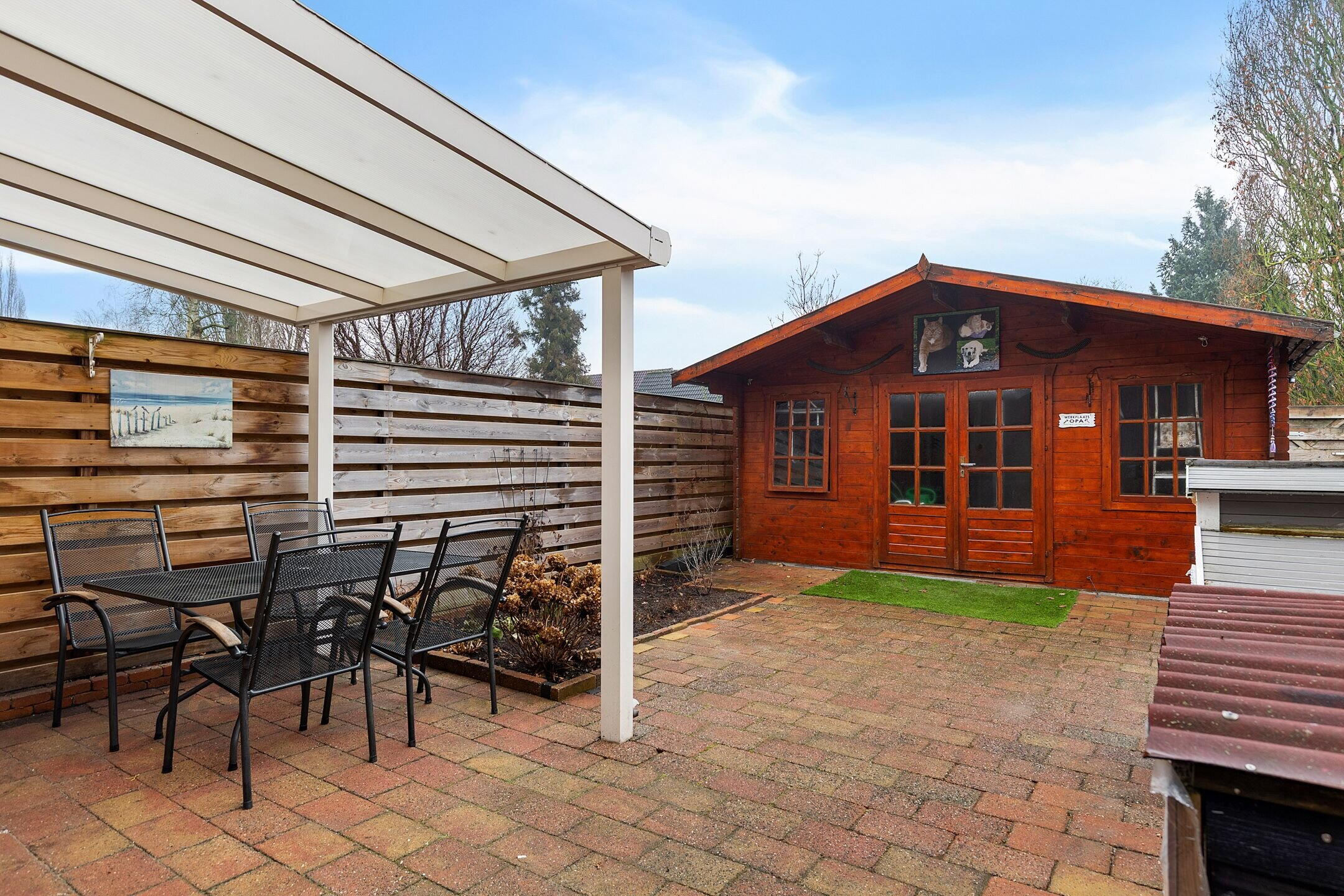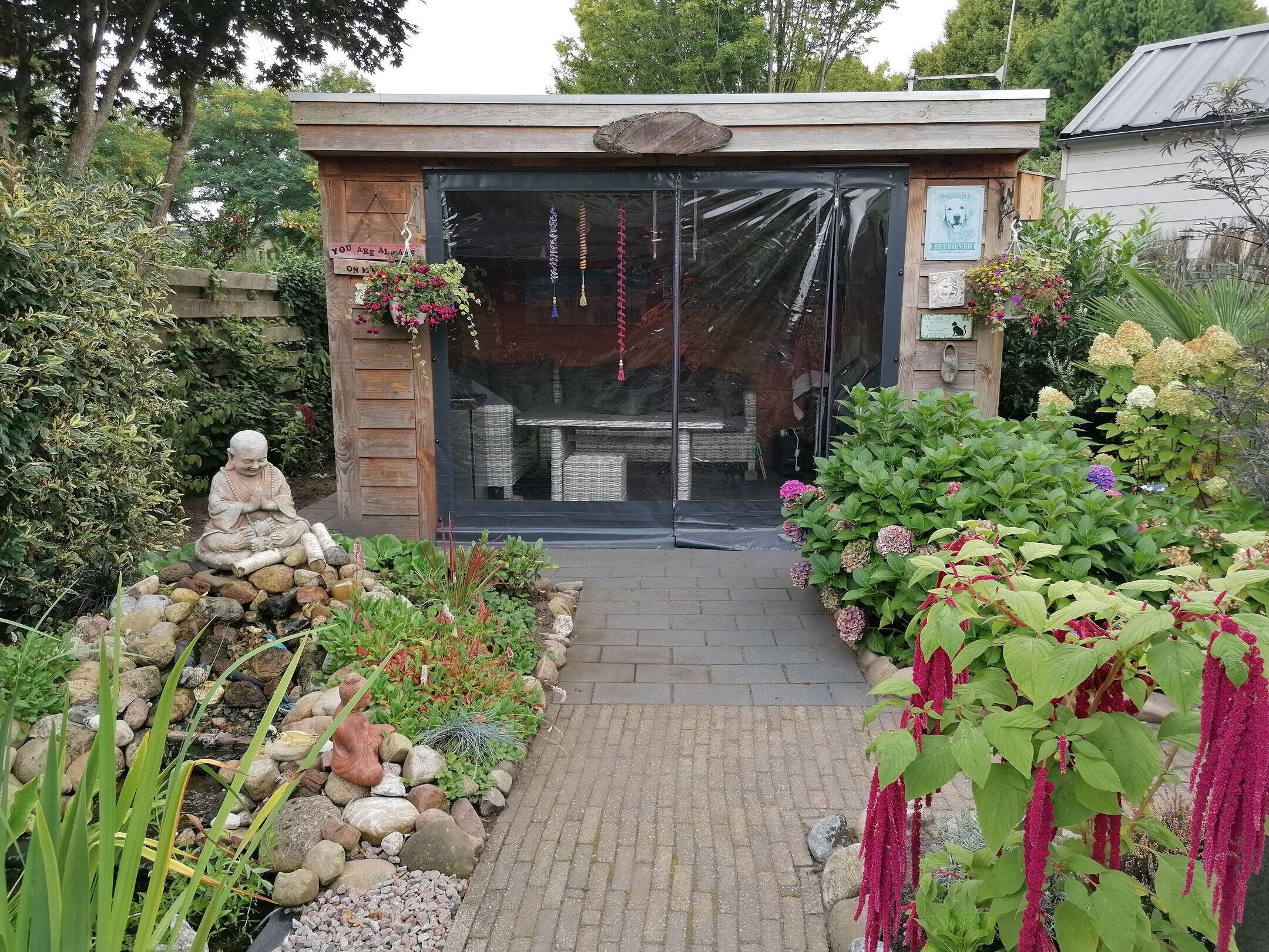 De zonnige tuin op het zuiden is fraai aangelegd en voorzien van meerdere borders, een gezellige houten overkapping en een vrijstaande houten schuur. Direct aan de achterzijde van de woning bevindt zich eveneens een overkapping, waardoor het buitenleven optimaal kan worden benut.